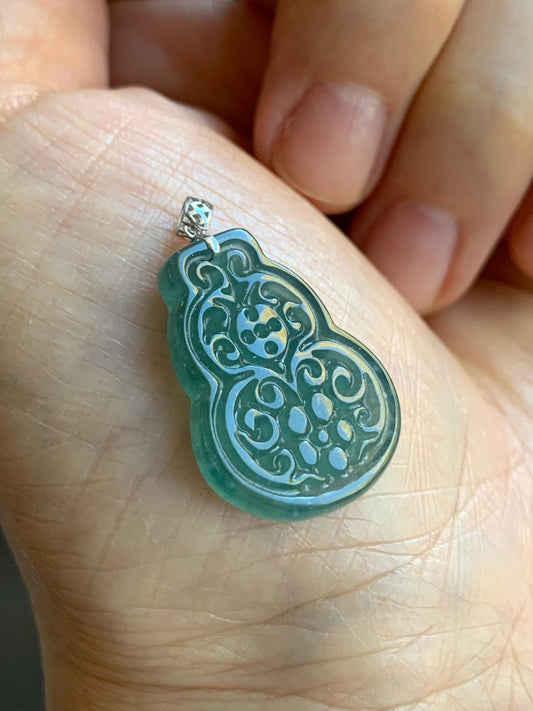 Natural Guatemalan Icy Translucent Teal Blue Jadeite Engraved Hulu Gourd Pendant 18K White Gold 3g 天然冰危蓝翡翠仿古雕葫芦镶嵌吊坠 A