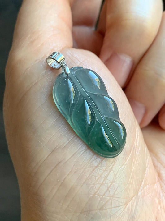 Natural Guatemalan Premium Icy Highly Translucent Light & Teal Blue Jadeite Carved Leaf Pendant 18K White Gold 5g 天然冰危蓝起光翡翠大叶有成镶嵌吊坠 HLZ825Y