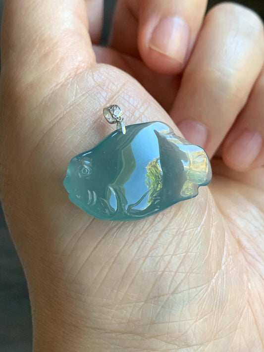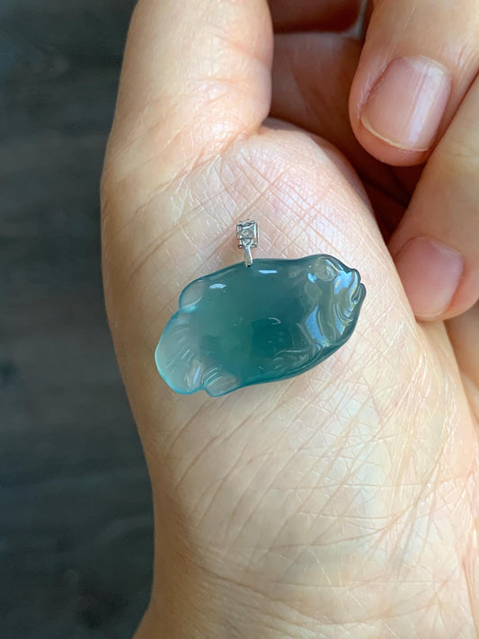 Natural Grade A Guatemalan Icy Translucent Gelatinous Old Mine Teal Blue Jadeite Fish Pendant 18K White Gold 4g 天然老种冰胶危蓝翡翠鱼镶嵌吊坠 A