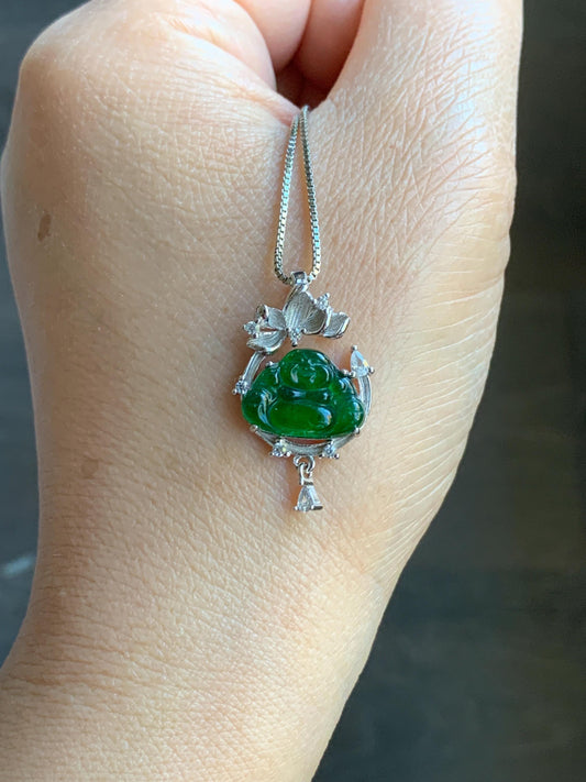 Petite Natural Guatemalan Icy Translucent Vibrant Green Jadeite Carved Buddha Pendant Sterling Silver 天然冰危绿翡翠佛公镶嵌吊坠 LFG910
