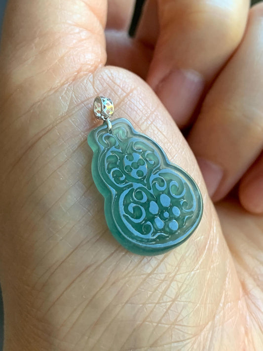 Natural Guatemalan Icy Translucent Teal Blue Jadeite Engraved Hulu Gourd Pendant 18K White Gold 3g 天然冰危蓝翡翠仿古雕葫芦镶嵌吊坠 B