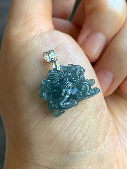 Certified Natural Guatemalan Icy Translucent Gelatinous Dusty Blue Jadeite Wu Shi Pai Lion Head Pendant S925 Sterling Silver 天然冰危蓝翡翠银镶无事牌吊坠