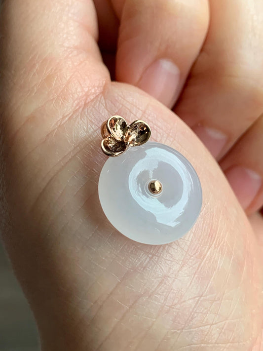 Certified Natural Icy Translucent Gelatinous White Jadeite Ping An Kou Donut Pendant 18K Rose Gold 4g 天然冰胶白色粉底翡翠平安扣玫瑰金镶嵌吊坠 7425
