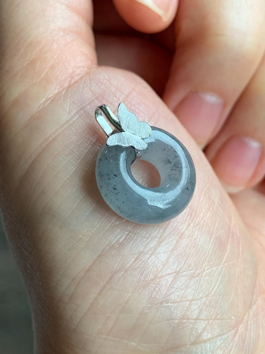 Certified Natural Icy Translucent Gelatinous Wuji Jadeite Ping An Kou Donut Butterfly Pendant 18K White Gold 天然冰胶乌鸡翡平安扣蝴蝶镶嵌吊坠 7416