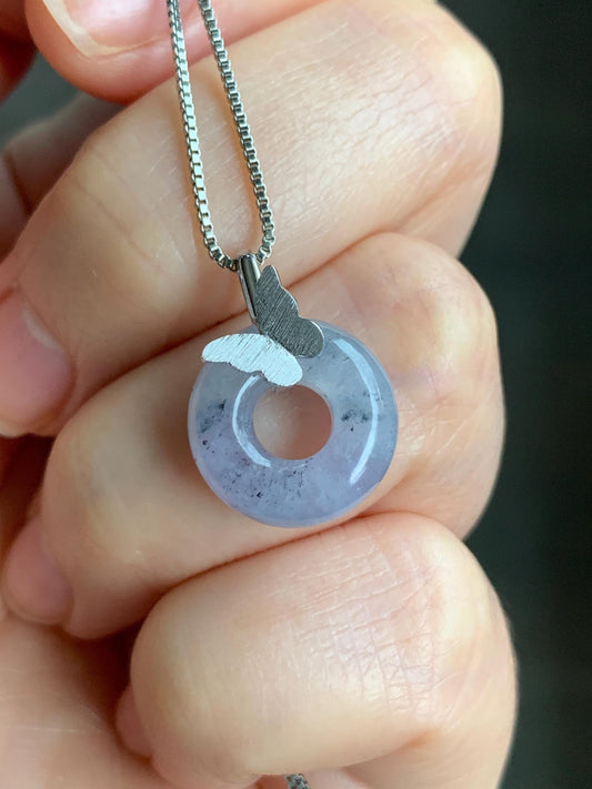 Certified Natural Icy Translucent Gelatinous Wuji Jadeite Ping An Kou Donut Butterfly Pendant 18K White Gold 天然冰胶紫乌鸡翡平安扣蝴蝶镶嵌吊坠 7427