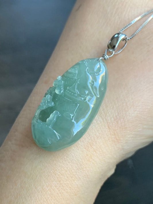 Natural Icy Translucent Gelatinous Dusty Green Jadeite Shan Shui Pai Landscape Scenery Pendant Sterling Silver 天然冰晴绿翡翠精工雕山水牌吊坠