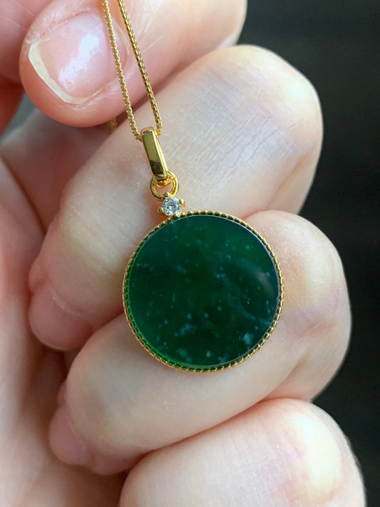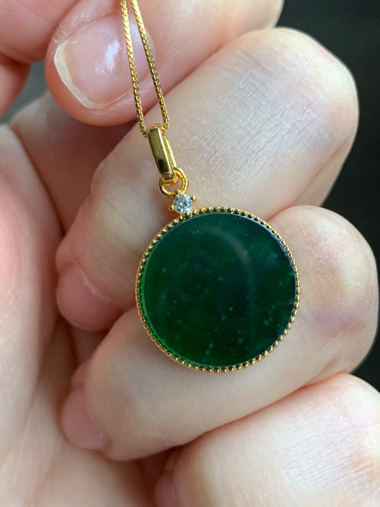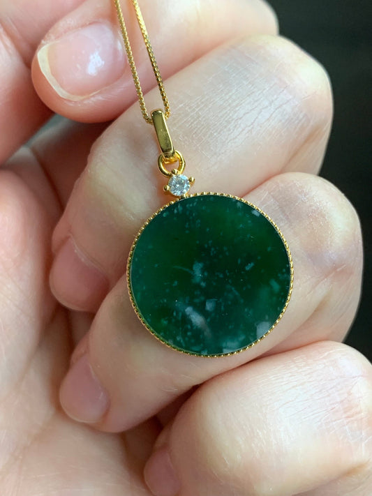 Natural Guatemalan Icy Translation Deep Teal Green Jadeite Round Wu Shi Pai Pendant Sterling Silver Yellow Gold Finish 天然冰危湖水绿飘雪花翡翠无事牌镶嵌吊坠 A