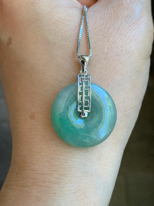 Natural Icy Translucent Bright Green Marbled Jadeite Ping An Kou Donut Pendant S925 Sterling Silver 天然绿飘花翡翠平安扣吊坠 B