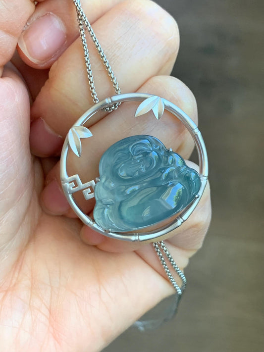 Certified Natural Guatemalan Premium Icy Highly Translucent Dusty Blue Jadeite Buddha Pendant Sterling Silver 9.44g 天然老种高冰危蓝翡翠起冰起光佛公镶嵌吊坠 617