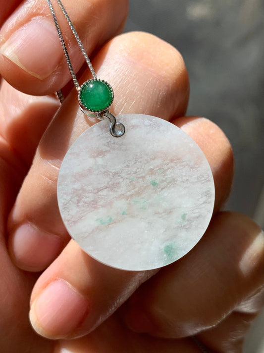 Certified Natural Icy Translucent Light Green Jadeite w/ Green Marbling Wu Shi Pai Pendant Sterling Silver 天然莫西沙晴飘绿翡翠无事牌镶嵌吊坠