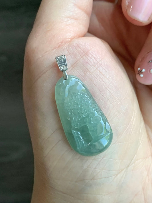 Natural Guatemalan Premium Icy Highly Translucent Light Teal Green Jadeite Lotus Flower & Fish Pendant Sterling Silver 天然高冰危晴色翡翠荷花鱼吊坠
