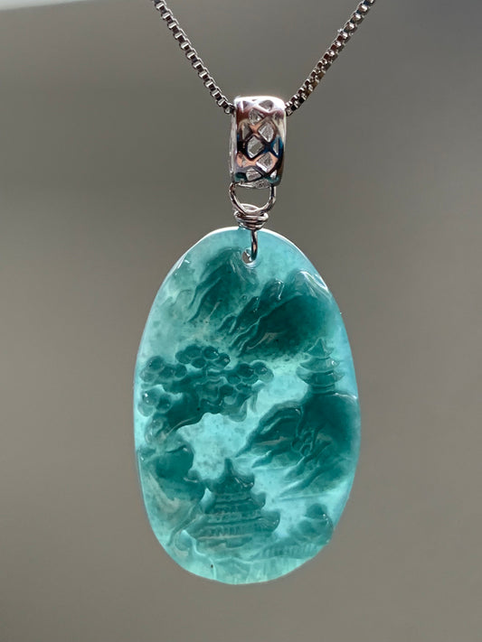 Natural Guatemalan Dark Teal Blue Jadeite Carved Shan Shui Pai Landscape Tag Pendant Sterling Silver 天然冰危深蓝水翡翠山水牌吊坠 B