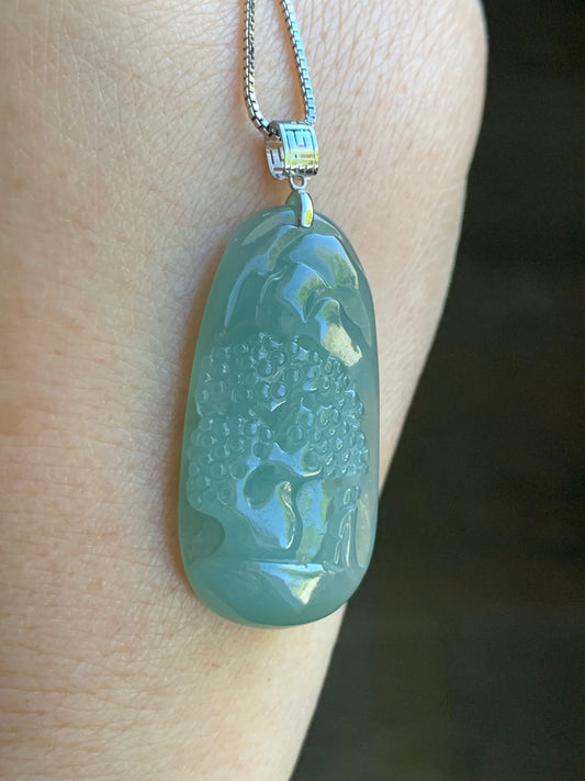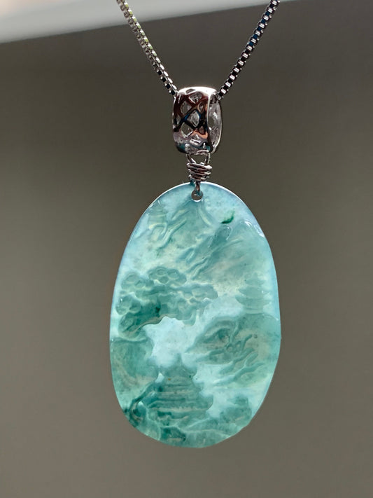 Natural Guatemalan Dark Teal Blue Jadeite Carved Shan Shui Pai Landscape Tag Pendant Sterling Silver 天然冰危深蓝水翡翠山水牌吊坠 A