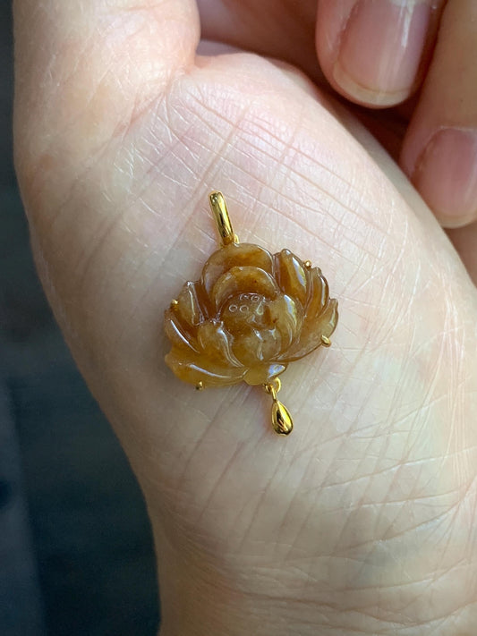 Certified Natural Icy Translucent Intense Rich Yellow Jadeite Carved Lotus Flower Pendant 18K Yellow Gold 2.32g 天然冰黄翡翠莲花镶嵌吊坠 3031