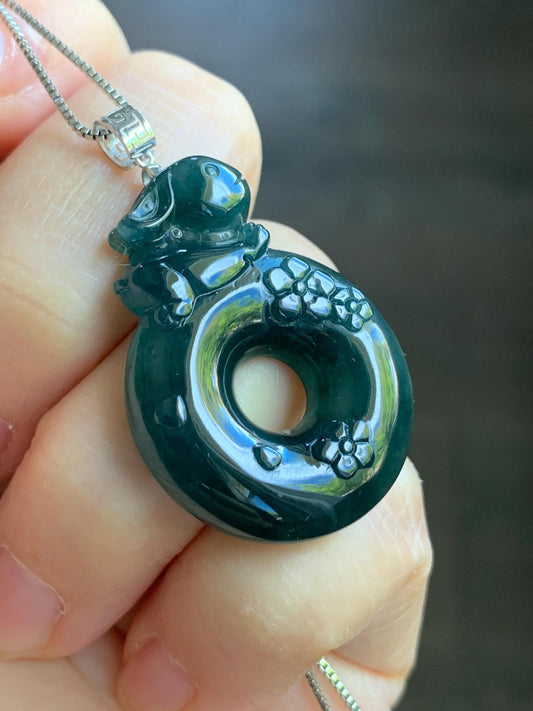 Natural Guatemalan Icy Translucent Dark Teal Blue Jadeite Rabbit Cherry Blossom Ping An Kou Donut Pendant 18K White Gold 天然冰危深蓝翡翠小兔梅花平安扣吊坠