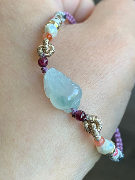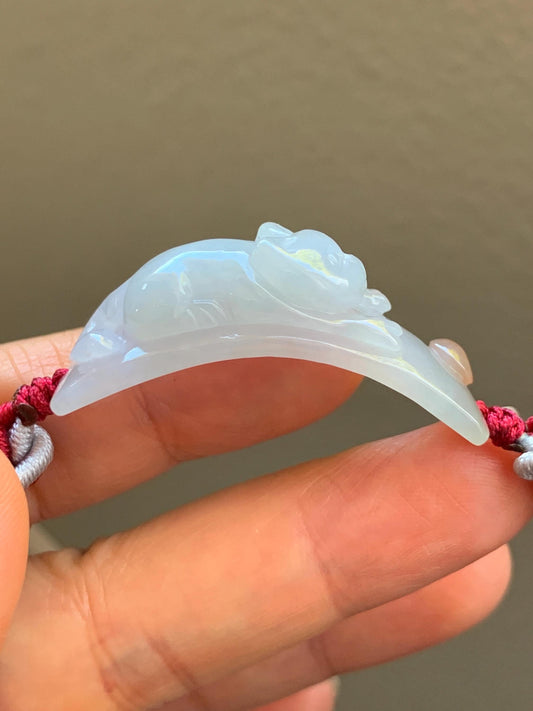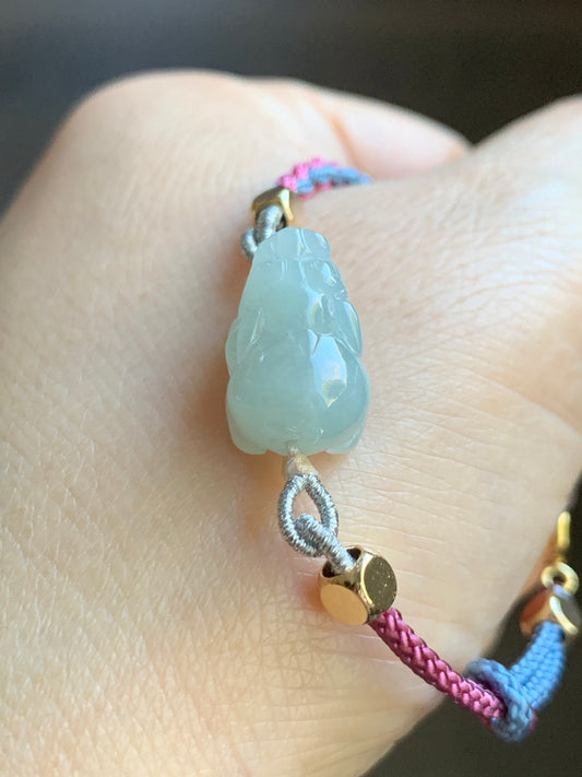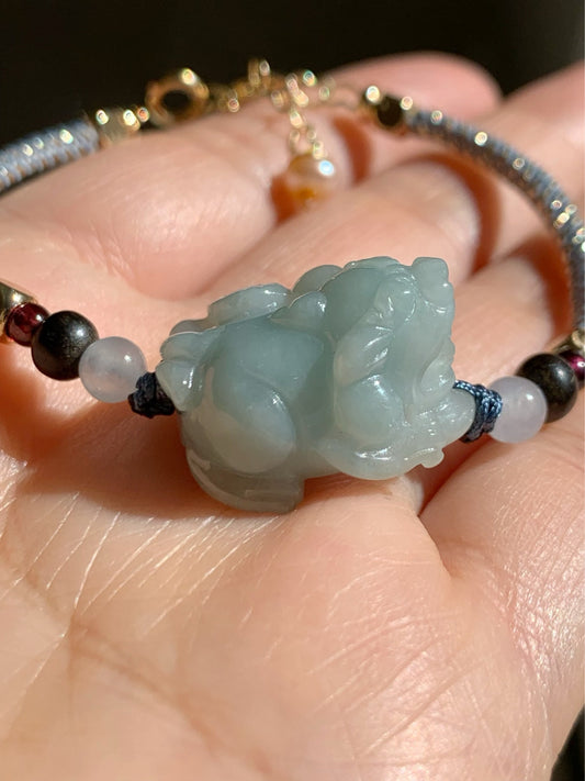 Natural Icy Translucent Gelatinous Pale Blue Jadeite Pixiu Rope Bracelet Adjustable 5" to 6.75" 天然冰胶淡蓝翡翠貔貅手绳