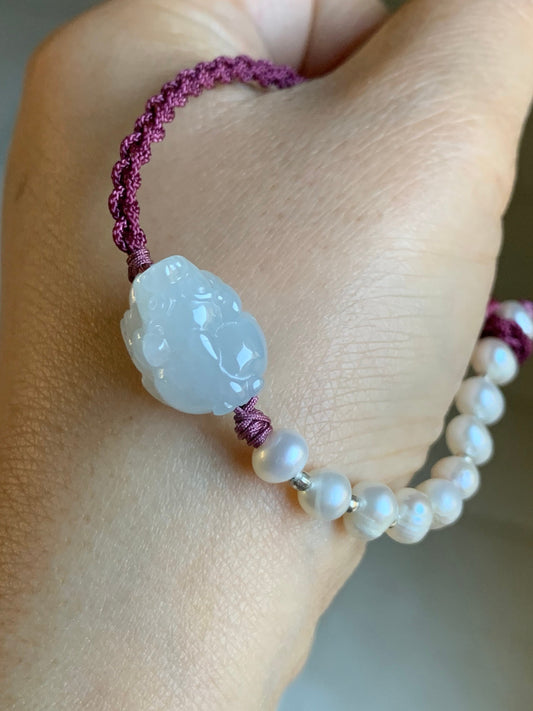 Natural Grade A Icy Translucent Gelatinous Pure White Jadeite Carved Pixiu Rope Bracelet w/ Freshwater Pearls Adjustable 天然冰胶白冰翡翠貔貅珍珠手绳