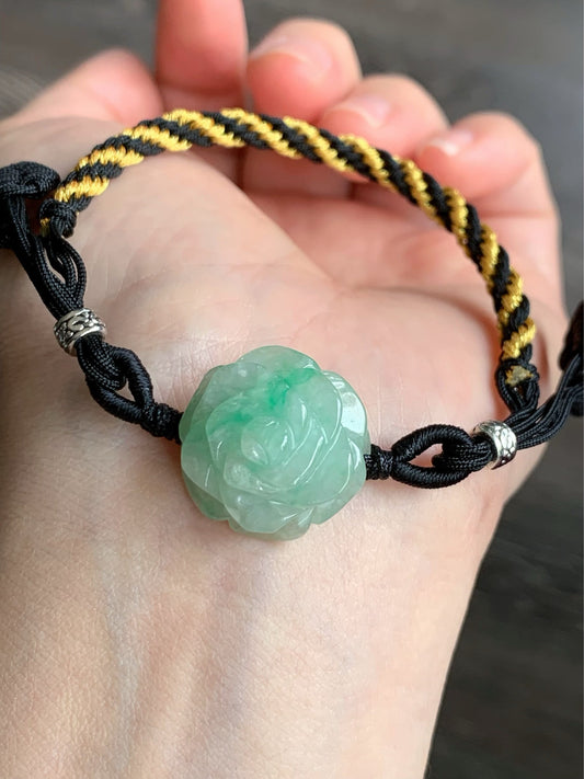 Natural Icy Translucent & Gelatinous Green Marbled Jadeite Carved Rose Flower Rope Bracelet Adjustable 6"-8.5” 天然冰绿飘花翡翠玫瑰花手绳