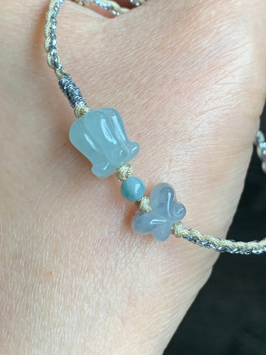 Natural Icy Translucent Gelatinous Light Green Jadeite Carved Tulip & Wuji Butterfly Rope Bracelet Adjustable 天然冰胶晴底翡翠郁金香与乌鸡蝴蝶手绳
