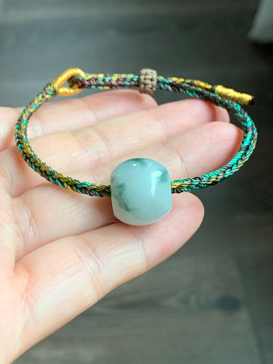 Natural Translucent White Jadeite w/ Green Marbling Large Drum Bead Rope Bracelet Adjustable 天然细糯飘花翡翠大鼓珠手绳