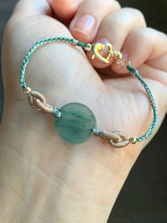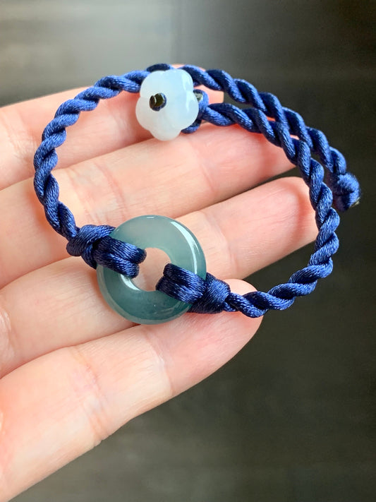 Natural Guatemalan Icy Translucent Teal Blue Jadeite Ping An Kou Donut Ring & Cherry Blossom Button Rope Bracelet 7" 天然冰危蓝水翡翠平安扣梅花手绳