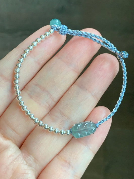 Natural Guatemalan Icy Highly Translucent Light Blue Jadeite Carved Leaf Sterling Silver Beads Rope Bracelet Adjustable 天然冰危淡蓝起光翡翠大叶有成银珠手绳