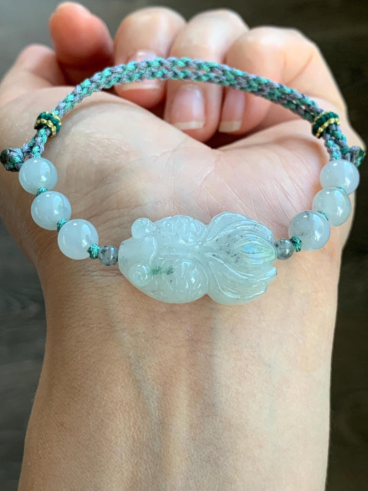 Natural Icy Translucent Gelatinous Wuji Jadeite w/ Green Marbling Carved Goldfish Rope Bracelet Adjustable 天然冰胶乌鸡飘绿花翡翠金鱼手绳