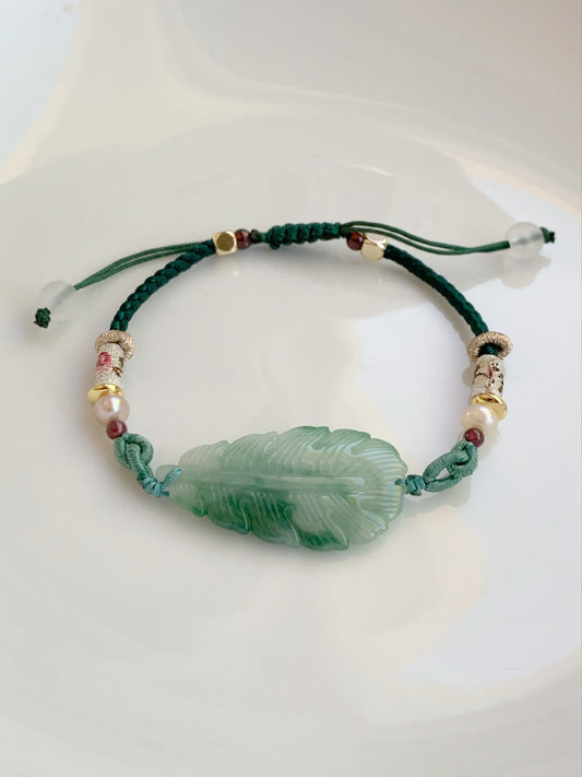 Natural Icy Translucent Light Green Jadeite w/ Intense Green Marbling Carved Feather Rope Bracelet 6.5” Adjustable 天然糯冰晴底飘花翡翠羽毛手绳