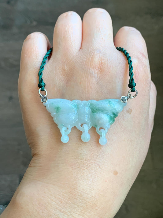 Natural Grade A Icy Translucent Green Marbled Jadeite Butterfly Pendant Rope Necklace Sterling Silver Clasp 20” 11g 天然冰飘花翡翠蝴蝶玉衡吊坠项链 A