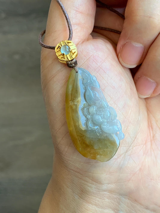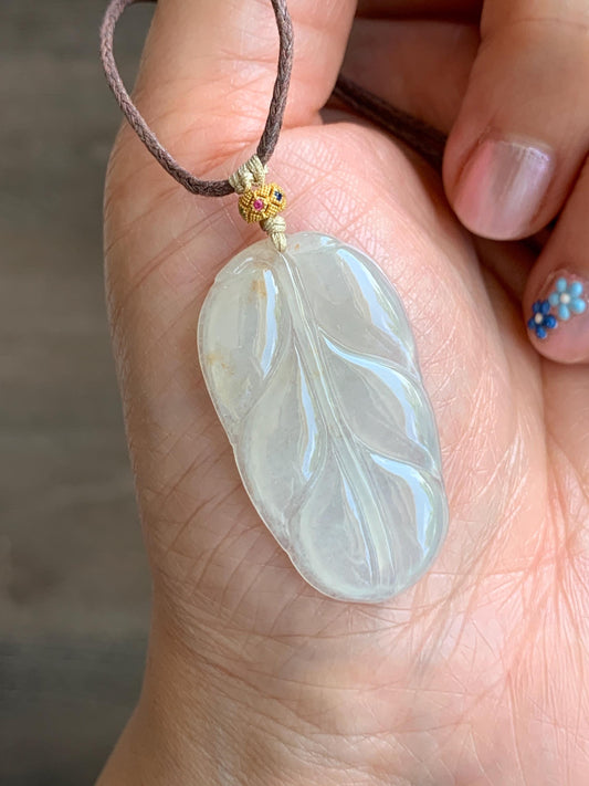 Natural Grade A Icy Highly Translucent Light Beige Golden Marbled Jadeite Leaf Pendant Rope Necklace 24" Adjustable 天然冰糖撒金翡翠大叶有成吊坠项链 MBT-S