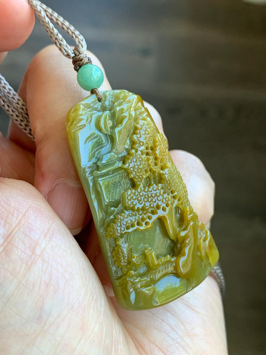 Natural Grade A Guatemalan Icy Translucent Intense Yellow Jadeite Shan Shui Landscape Pendant Rope Necklace 25” 16g 天然冰危黄翡翠山水牌吊坠 WHSS