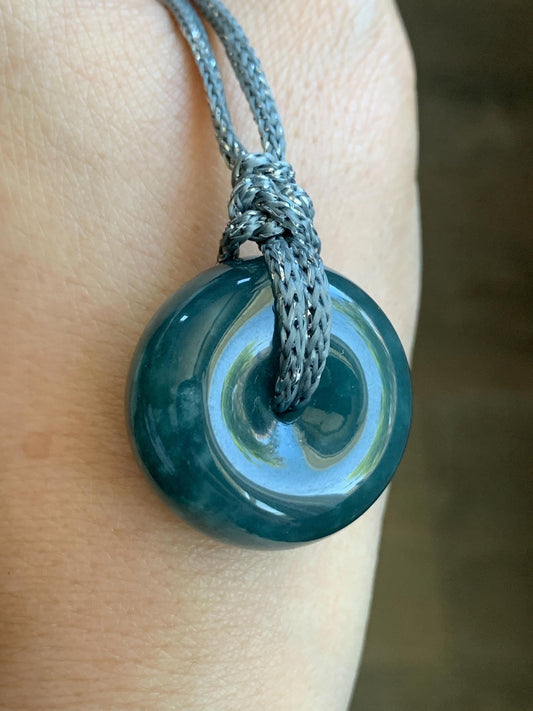 Natural Guatemalan Icy Translucent Dark Teal Blue Jadeite Thick Ping An Kou Donut Pendant Rope Necklace Adjustable 24" 天然冰危深蓝翡翠平安肥扣吊坠 DFP-2