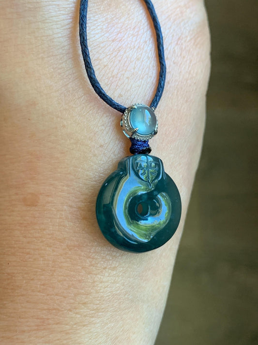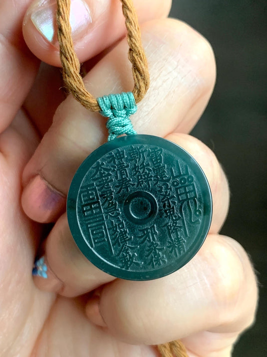 Natural Guatemalan Icy Translucent Dark Teal Green Jade Jadeite Mountain Ghost Eight Trigrams Coin Pendant Rope Necklace 天然冰危蓝绿翡翠精工山鬼币吊坠 SGA