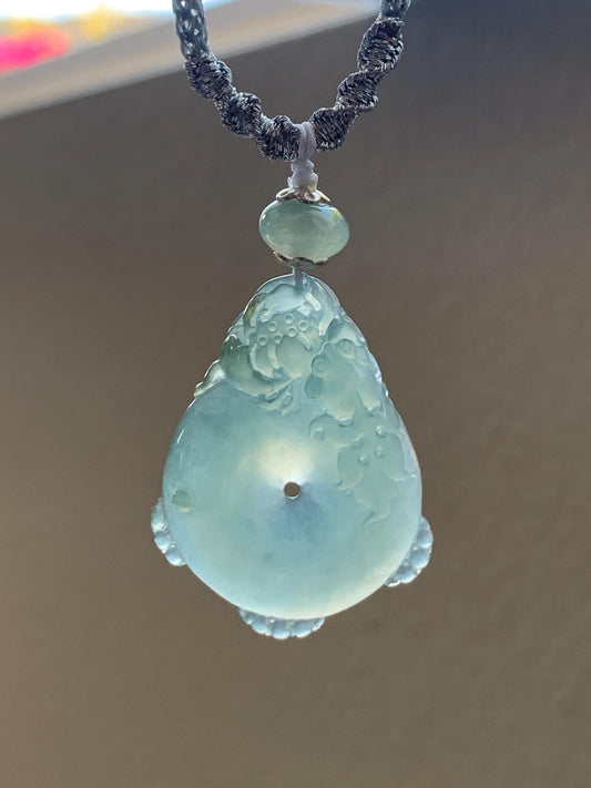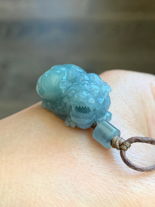 Natural Grade A Icy Translucent Gelatinous Light Blue Jade Jadeite Carved Pixiu Pendant Rope Necklace 25" 12g 天然冰胶浅蓝翡翠精工貔貅吊坠 MTL