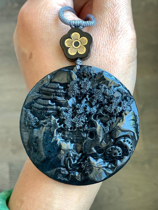 Large Natural Grade A Guatemalan Opaque Black Jadeite Carved Shan Shui Scenery Landscape Pendant Rope Necklace 32” 47g 天然危墨翠翡翠山水牌吊坠 WQM280