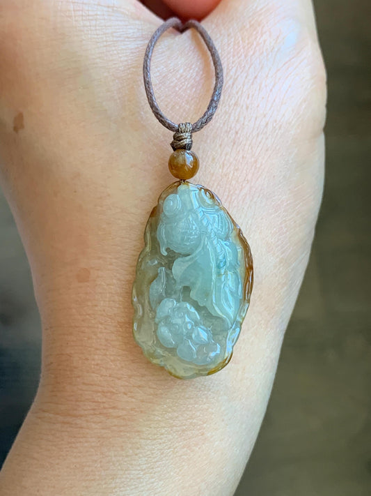 Natural Grade A Icy Highly Translucent Yellow Marbled Bicolored Jadeite Lotus Flower Goldfish Pendant Rope Necklace 25" 天然冰黄皮料翡翠莲花鱼吊坠 SHY220