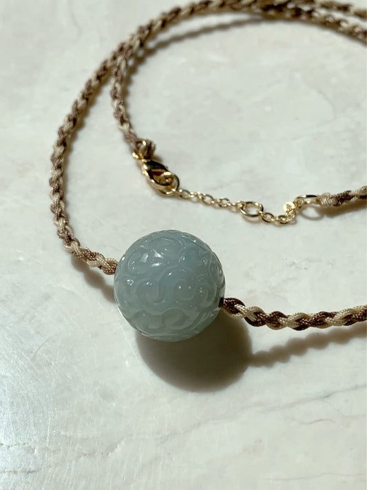 Huge Natural Icy Translucent Sky Blue Jadeite Retro Engraved Single Sphere Bead Rope Necklace Adjustable 17"-18.25" 天然天空蓝翡翠仿古雕单珠项链