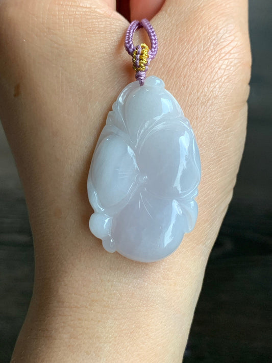 Natural Translucent Light Lavender Jadeite Carved Lotus Leaf Pendant Rope Necklace 24” Adjustable 天然细糯淡紫底翡翠荷叶吊坠