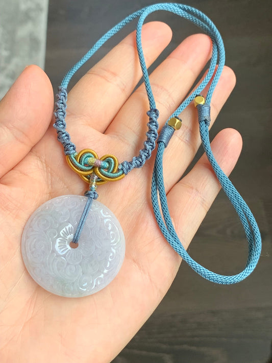 Large Natural Icy Light Purple Jadeite Retro Engraved Ping An Kou Donut Pendant Rope Necklace 26” Adjustable 天然冰糯淡紫翡翠平安扣吊坠项链 B