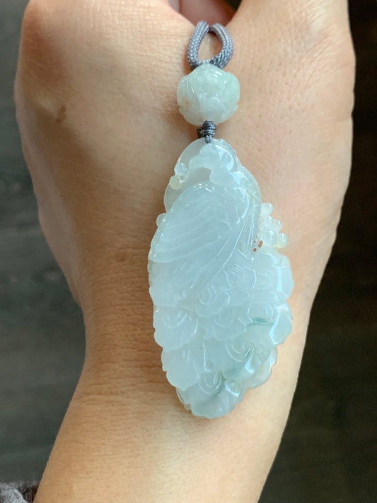 Certified Natural Icy Translucent Gelatinous Jadeite Carved Peacock Pendant w/ Peony Rope Necklace 32” Adjustable 18g 天然冰胶翡翠孔雀牡丹项链