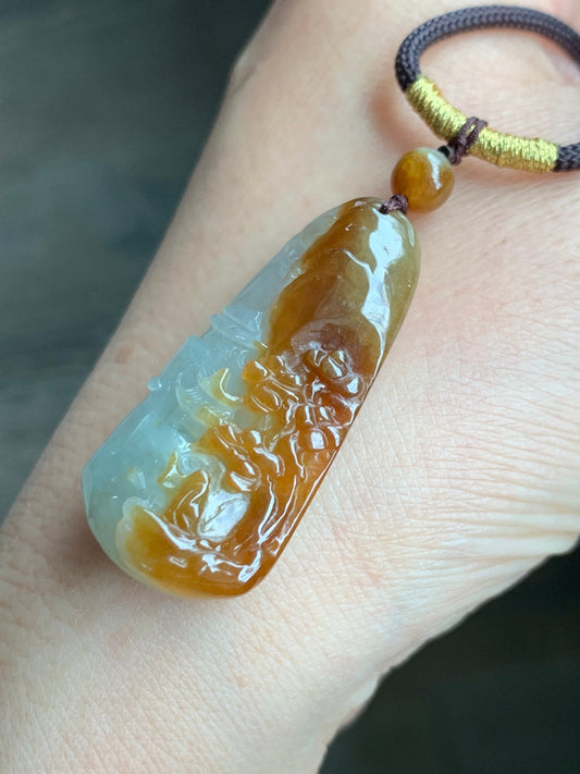Natural Icy Translucent Intense Bicolored Red Yellow Jadeite Shan Shui Landscape Pendant Rope Necklace 26” 11g 天然半山半水红黄翡翠山水牌吊坠