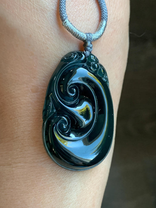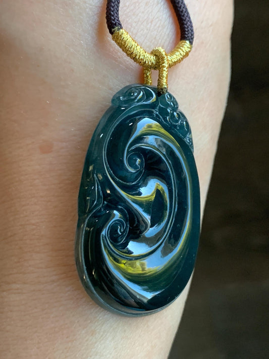 Natural Guatemalan Icy Translucent Dark Dusty Teal Green Jadeite Carved Ruyi Pendant Rope Necklace 24” Adjustable 9g 天然冰危深墨绿翡翠如意吊坠 HSH