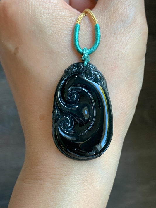 Large Natural Guatemalan Icy Translucent Dark Teal Blue Jadeite Carved Ruyi Pendant Rope Necklace 28" Adjustable 14g 天然冰危湖水蓝翡翠如意吊坠 YSH
