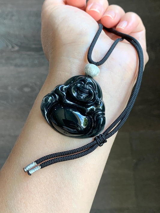 Natural Guatemalan Translucent Dark Wuji Jadeite Large Buddha Pendant Rope Necklace Sterling Silver Adjustable 33" 27g 天然冰危乌鸡翡翠大佛公吊坠