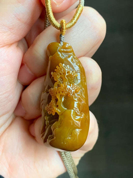 Certified Natural Guatemalan Icy Translucent Intense Rich Yellow Jadeite Shan Shui Landscape Pendant Rope Necklace 32” 天然冰危鸡油黄翡翠山水牌吊坠 6917
