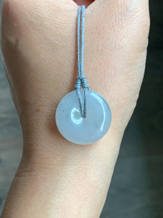 Natural Icy Translucent Gelatinous Light Wuji Marbled Jadeite Ping An Kou Donut Pendant Rope Necklace 25” 8g 天然老种冰胶乌鸡翡翠平安扣吊坠