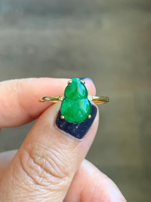 Natural Guatemalan Icy Translucent Vibrant Green Jadeite Gourd Hulu Solitaire Ring Sterling Silver Size 7 Adjustable 天然冰危绿翡翠葫芦蛋面银镶戒指 WHJ88