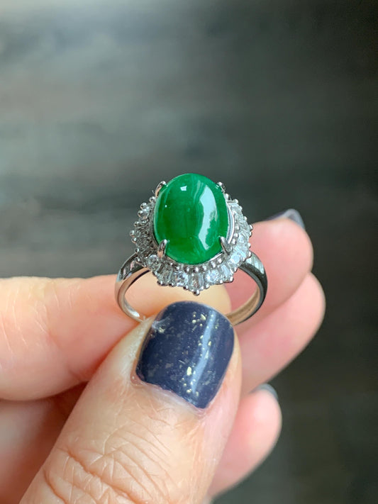 Certified Natural Grade A Guatemalan Icy Translucent Vibrant Green Oval Jade Jadeite Ring Sterling Silver Size Adjustable 天然冰危绿翡翠蛋面银镶戒指 9440