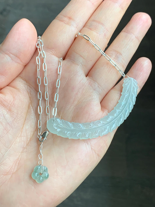 Natural Grade A Icy Highly Translucent Jade Jadeite Crescent Feather Pendant 999 Sterling Silver Necklace 19" 8g 天然冰胶晴底翡翠羽毛玉横足银项链 MBY250