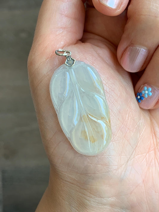Natural Grade A Icy Highly Translucent Light Beige Golden Marbled Jade Jadeite Leaf Pendant Sterling Silver 6g 天然冰糖撒金翡翠大叶有成吊坠 MBT-Y